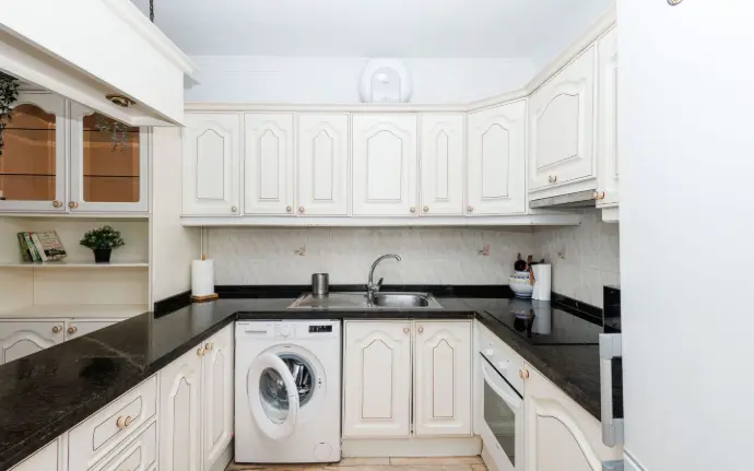 El apartamento cuenta con tres dormitorios: dos con camas dobles y uno con una cómoda cama individual, lo que proporciona flexibilidad para diferentes configuraciones familiares. Los armarios empotrados facilitan el mantenimiento del orden del equipaje. El baño está equipado con bañera, perfecta para largos baños después de un día en la playa.