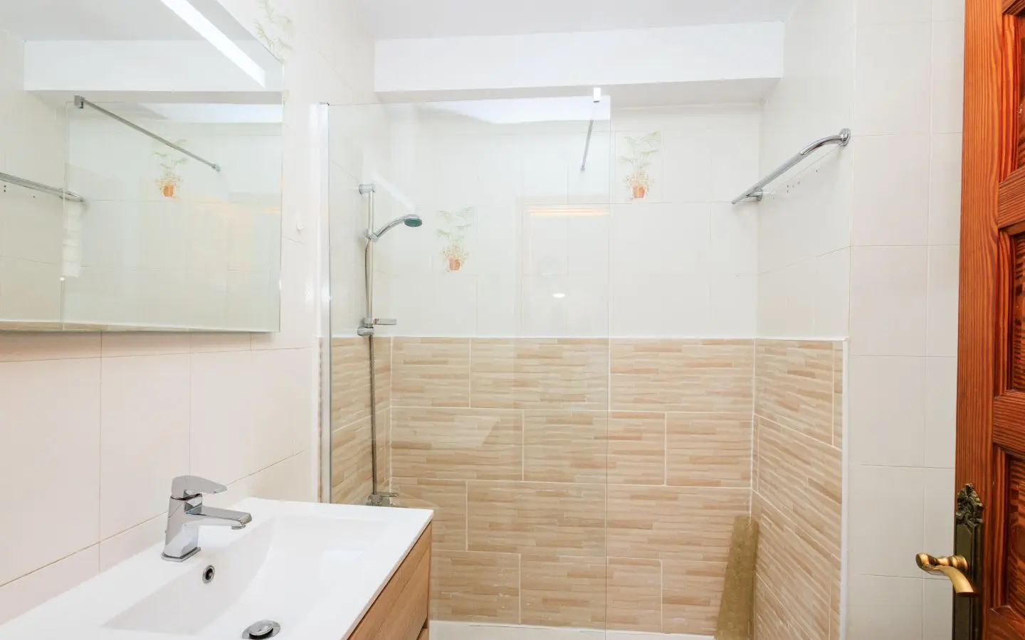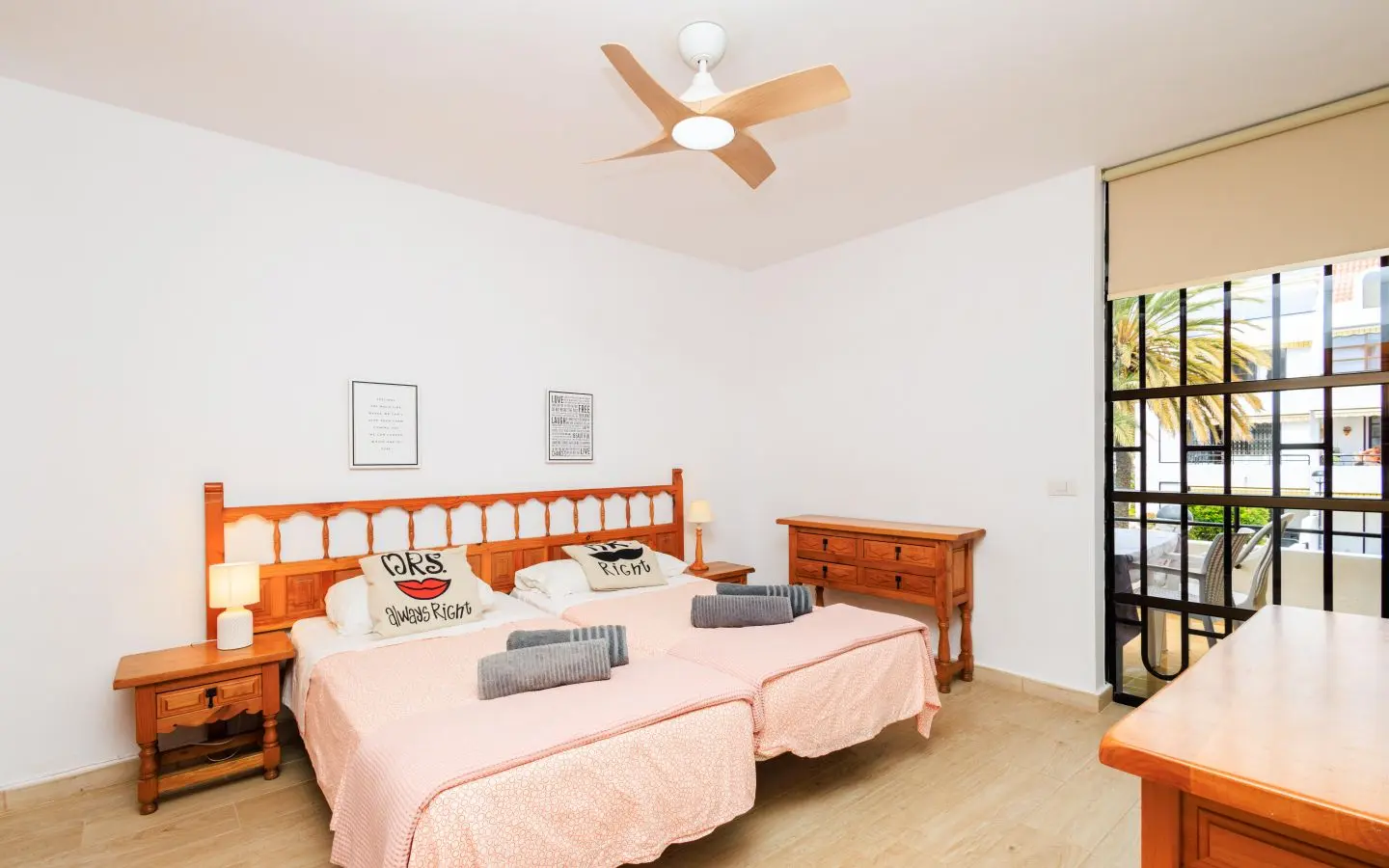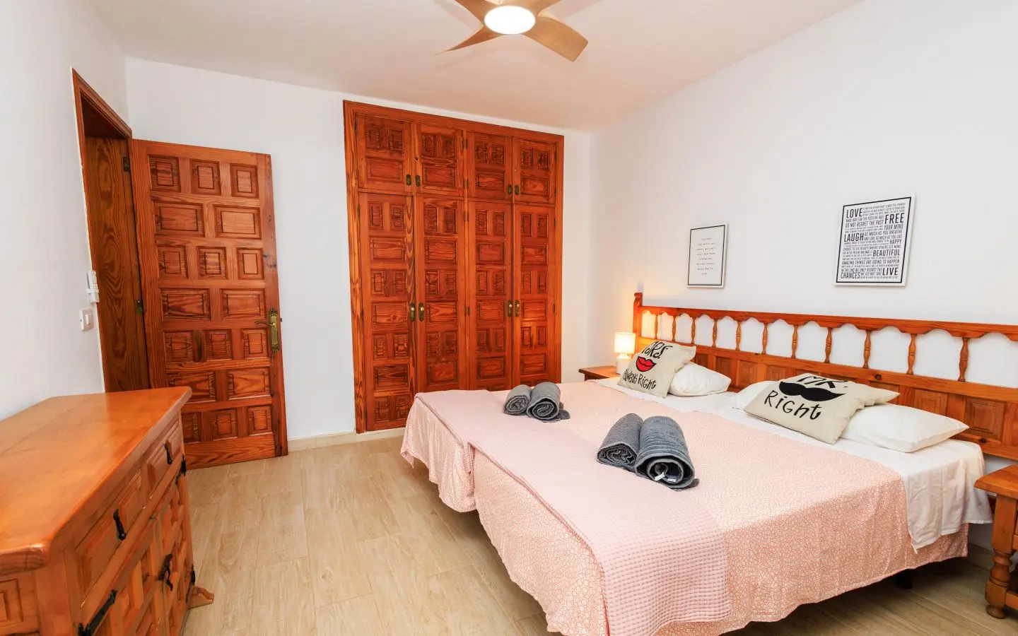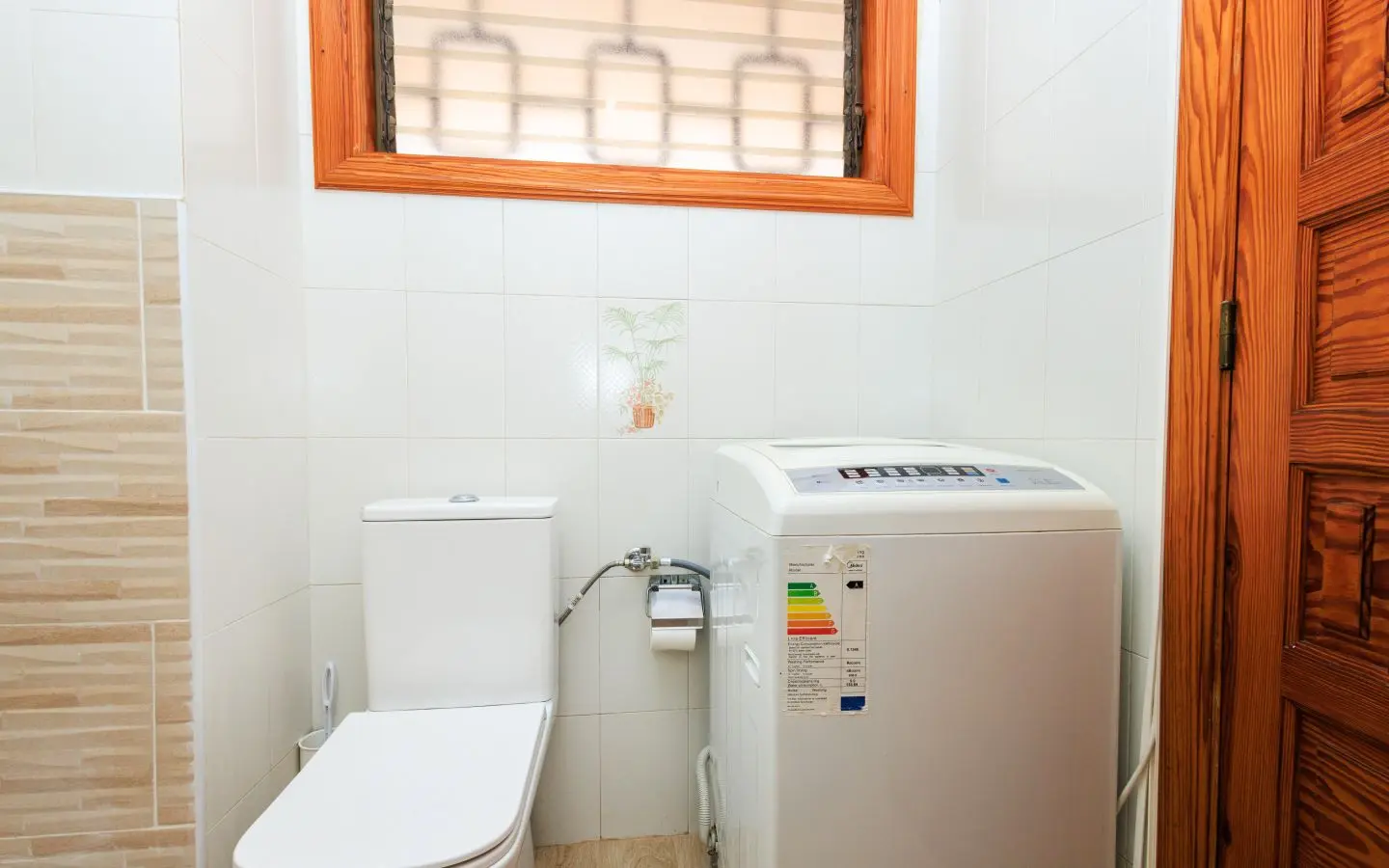 El apartamento tiene dos dormitorios cómodos: uno con camas separadas que se pueden juntar, y otro con dos camas separadas, ambos con armarios empotrados para un amplio almacenamiento. El baño está equipado con ducha y lavadora, proporcionándole todas las comodidades que necesita.