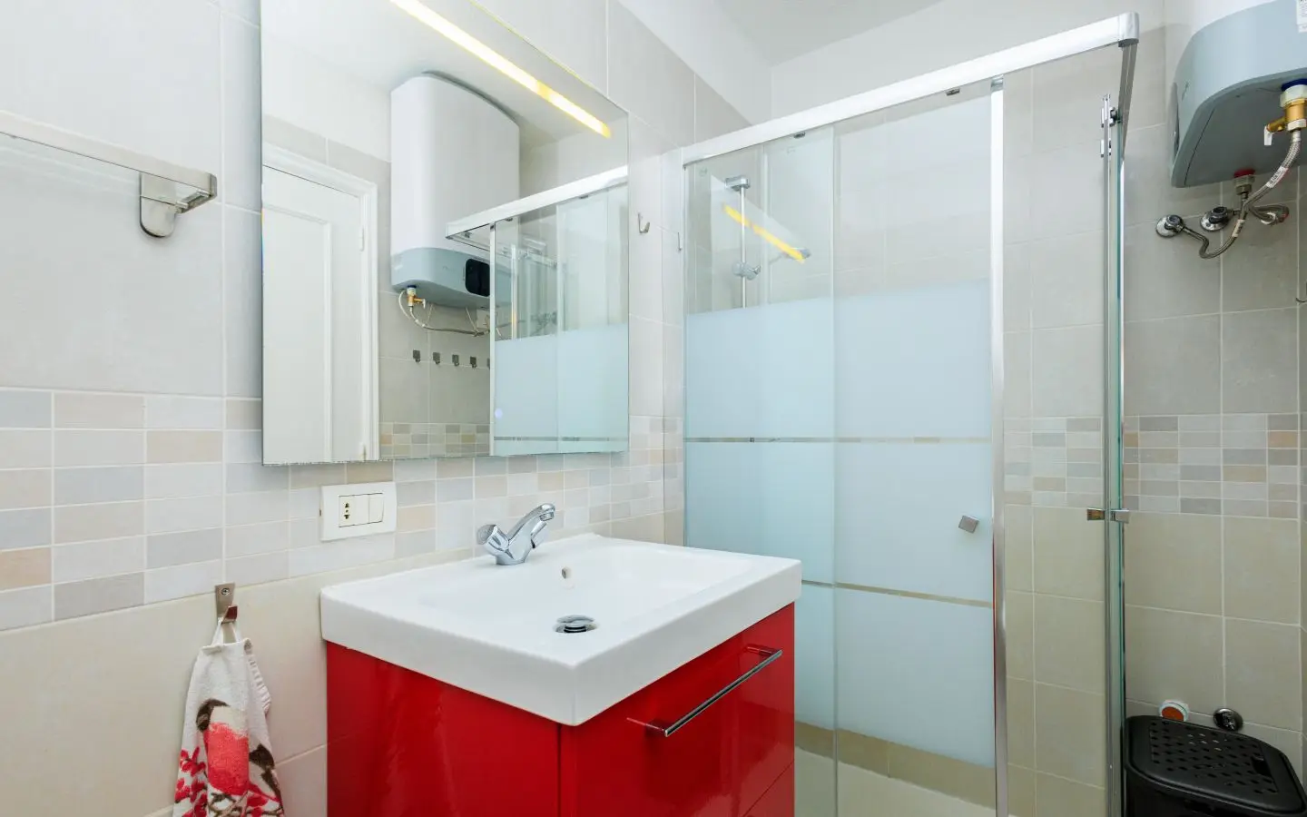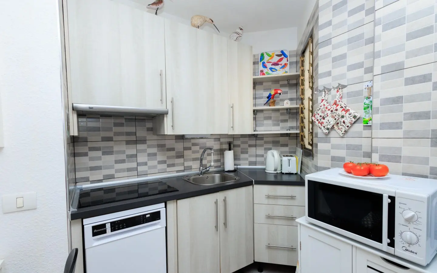 La cocina abierta está totalmente equipada con un práctico lavavajillas, lo que facilita la cocina y la limpieza. Se fusiona con la luminosa sala de estar, donde un sofá cama proporciona espacio adicional para dormir si es necesario. Desde la sala de estar, las puertas conducen a un balcón soleado y cómodo, que da a la hermosa piscina del complejo. Aquí puedes disfrutar de tu café de la mañana, leer un libro al sol o darte un chapuzón refrescante en la piscina.